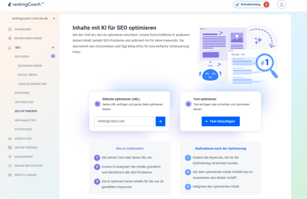 Fortschrittliche Anwendungen mit KI-gestützter Inhaltsoptimierung machen diesen Prozess noch reibungsloser. Mit dem KI-Textoptimierer von rankingCoach kannst du deinen Text eingeben und unser System scannt und analysiert deinen Inhalt, fügt relevante Keywords hinzu und ergänzt wichtige Meta-Informationen.