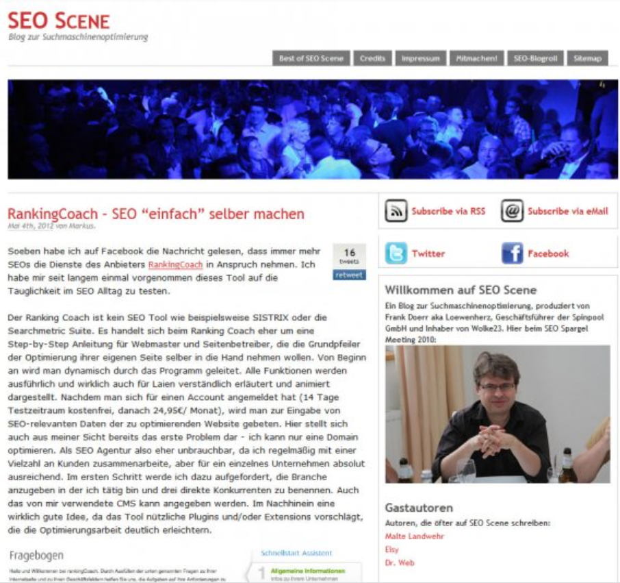 Markus, seines Zeichens Gründer & Head of SEO der KarMa Webmarketing GbR und Gastblogger auf seo-scene.de, zog bei seinem umfangreichen Test folgendes Resümee: „...Ich bin der festen Überzeugung, dass man mit Hilfe der Applikation definitiv eine solide Basis schaffen kann und somit Kosten in Form von teuren SEO Consultings spart, die im Grunde in den meisten Fällen im ersten Schritt auch nicht mehr veranlassen können. ..."