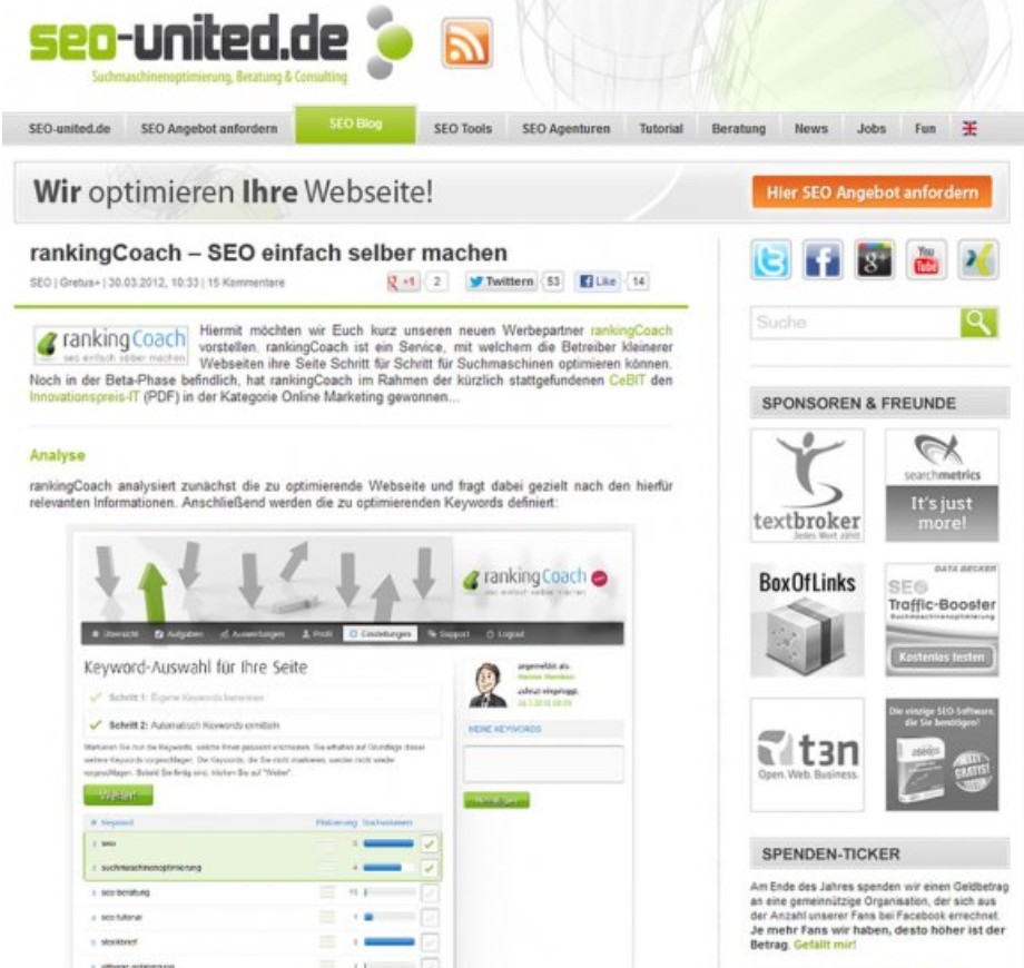Das seo-united-Team testet den rankingCoach bereits in der 1. Beta-Phase und schloss seinen Artikel über die Software mit dem Fazit: „...rankingCoach stellt eine unserer Meinung nach sinnvolle Möglichkeit dar, kleinere Webseitenbetreiber bei der Optimierung ihrer Seite hilfreich zur Seite zu stehen.