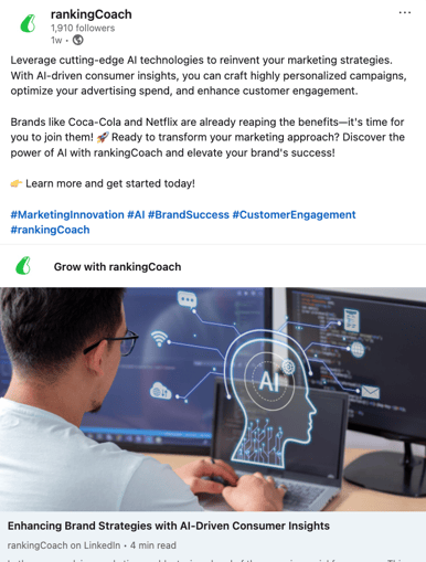 A continuación, se muestra una publicación de LinkedIn de rankingCoach que transmite de manera eficaz un mensaje claro mediante una combinación de texto e imagen: