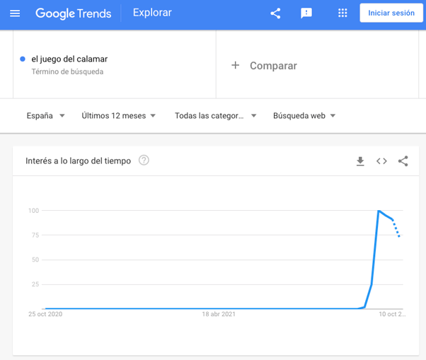 Por desgracia, Google no ofrece el volumen de búsqueda exacto de cada frase en el propio motor de búsqueda ni en sus herramientas gratuitas, como Google Trends. Esto es una sorpresa para muchas personas que asumen incorrectamente que los gráficos creados en Google Trends representan el volumen de búsqueda. En realidad, transmiten el porcentaje de popularidad de un término en relación con su momento más popular en el periodo de tiempo cubierto. Por ejemplo, sabemos que el interés de la gente por la serie de Netflix el Juego del Calamar ha alcanzado un pico recientemente y las búsquedas en Google son más altas que nunca, por lo que las búsquedas del término muestran un claro pico de interés, pero este gráfico no nos dirá si estas búsquedas fueron de decenas, miles o millones.
