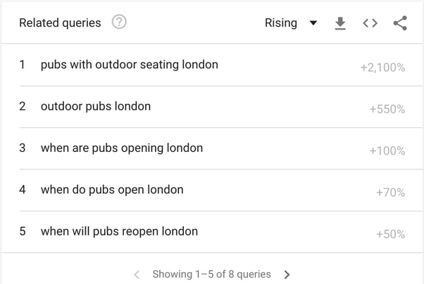 Esto hace que Google Trends sea una herramienta SEO para detectar las tendencias emergentes, por lo que un negocio en Londres puede ver que muchas más personas en Londres están buscando pubs con asientos al aire libre y esto definitivamente debería ser mencionado prominentemente en el sitio web de cualquier negocio que ofrezca esto.