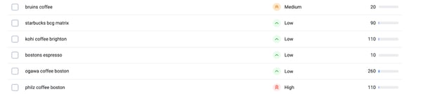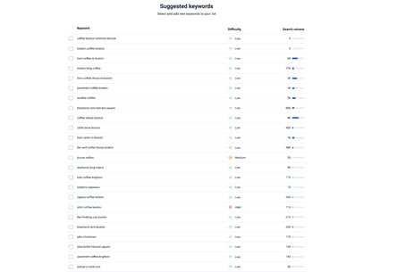 Cualquiera puede utilizar esta herramienta de palabras clave gratuitas de rankingCoach FREE para encontrar las palabras clave con mayor promedio de búsquedas mensuales de productos vendidos en tu historia. Esta es una manera rápida y fácil de encontrar buenas palabras clave. Por ejemplo, una tienda de café en Boston puede querer hacer una investigación de palabras clave para encontrar los términos que la gente en Boston está escribiendo en Google cuando están buscando tu taza de la mañana o cafés para el almuerzo. Estas herramientas de palabras clave les muestran una media de personas que utilizan esta frase en Google al mes en la zona del negocio.