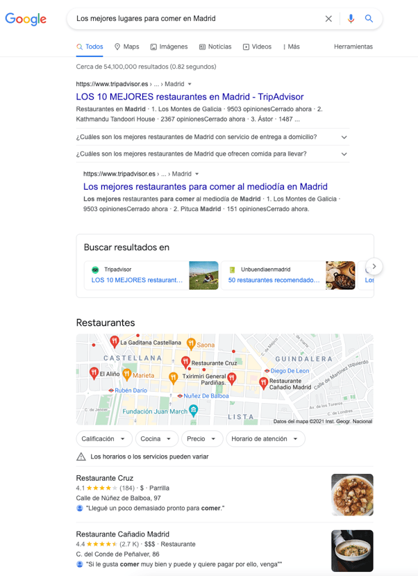 Los motores de búsqueda están haciendo constantemente nuevas conexiones entre palabras con significados similares, lo que significa que las mejores palabras clave para optimizar pueden cambiar con el tiempo. Por ejemplo, si escribimos en Google la frase clave “Los mejores lugares para comer en Madrid", los resultados que vemos en la SERP hacen referencia a los 10 MEJORES restaurantes de "Madrid". Estas páginas han sido claramente optimizadas para el término 'mejores restaurantes' pero aparecen en los resultados de esta búsqueda porque son las páginas que los buscadores que escriben mejor lugar para comer en Madrid'.