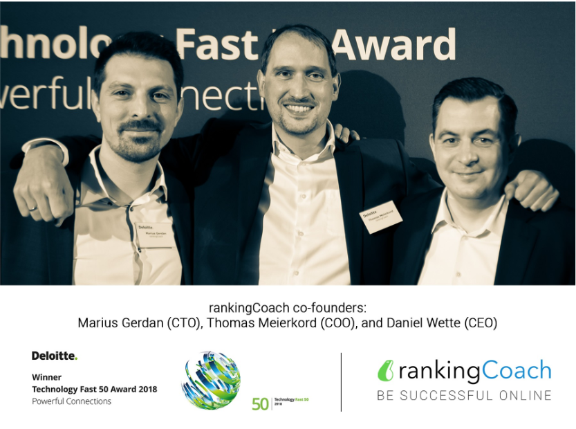 Cette photo représente les trois fondateurs de rankingCoach - Daniel Wette, Thomas Meierkord et Marius Gerdan - recevant le prix "Technology Fast 50" 2018 de Deloitte lors de la cérémonie du 8 novembre 2018 à Cologne.