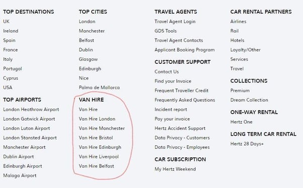 Il secondo esempio è quello di più sedi con lo stesso contenuto come in questa schermata di menu dal sito web di HERZ Questo è un altro falso esempio di una pagina di accesso perché anche se le informazioni su ciascuna delle pagine di noleggio furgoni sono simili, servono uno scopo molto diverso per ogni utente.