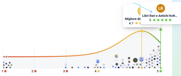 L'adozione di rankingCoach ha portato a risultati sorprendenti. La visibilità online di Luca è migliorata drasticamente, con un aumento significativo del traffico verso il suo sito web. Questo incremento ha portato a maggiori vendite e richieste di valutazione, consolidando la sua reputazione nel settore dell'antiquariato e dei libri rari. Le recensioni positive hanno ulteriormente rafforzato la sua posizione come leader di mercato. Attualmente, il business di Luca Piatti, "Libri Rari e Antichi Kottoya", vanta una valutazione perfetta di 5 stelle su Google My Business, come evidenziato nel grafico qui riportato. Questo straordinario risultato è un chiaro indicatore della qualità del servizio offerto e della fiducia che i clienti ripongono in lui.