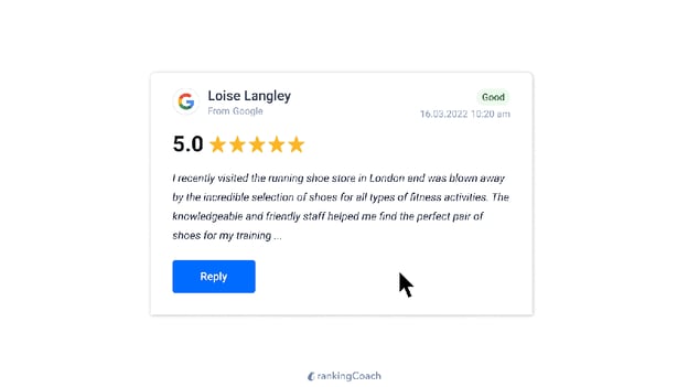 rankingCoach AI Assistant Reply rewolucjonizuje sposób, w jaki firmy zarządzają opiniami klientów, dzięki czemu zwiększanie swojego śladu cyfrowego i wzmacnianie silnych relacji z klientami jest prostsze niż kiedykolwiek. Bezpośrednią korzyścią z odpowiedzi asystenta AI jest możliwość zaoszczędzenia czasu firmom. Ale zalety sięgają znacznie głębiej:
