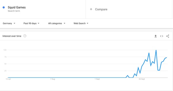 Infelizmente, o Google não oferece o volume exato de busca para cada frase no próprio mecanismo de busca ou em suas ferramentas gratuitas, como o Google Trends. Isto é uma surpresa para muitas pessoas que assumem incorretamente que os gráficos criados no Google Trends representam o volume de busca. Eles realmente transmitem a popularidade percentual de um termo em relação ao seu momento mais popular no período de tempo coberto. Por exemplo, sabemos que o interesse das pessoas pela série Netflix Squid Games atingiu um pico recentemente e as buscas no Google são mais altas do que nunca, portanto as buscas pelo termo mostram um claro pico de interesse, mas este gráfico não nos dirá se estas buscas foram em dezenas, milhares ou milhões.