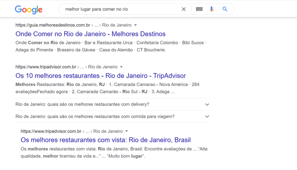 Os motores de busca estão constantemente fazendo novas conexões entre palavras com significados semelhantes, o que significa que as melhores palavras-chave para otimizar a vontade podem mudar com o tempo. Por exemplo, se eu digitar no Google a palavra-chave "melhores restaurantes de Rio de Janeiro", os resultados que vemos no SERP referem-se aos 10 MELHORES Restaurantes em "Rio de Janeiro". Estas páginas foram claramente otimizadas para o termo 'melhores restaurantes', mas elas aparecem nos resultados para esta busca porque estas são as páginas que os pesquisadores que digitam 'ótimo lugar para comer no Rio de Janeiro'.