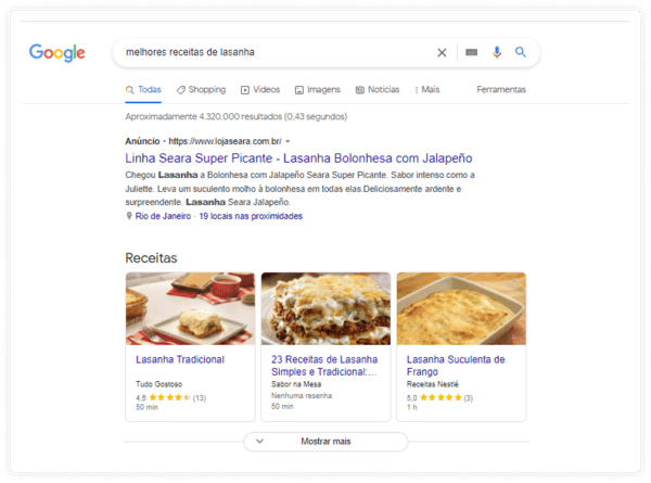 O título do artigo mais bem classificado é "A melhor receita de lasanha do mundo" - note que na consulta o prato foi escrito "Lasanha" e a palavra adjetivo "grande" foi usada. O algoritmo de busca do Google é suficientemente inteligente para saber que estas palavras têm o mesmo significado.