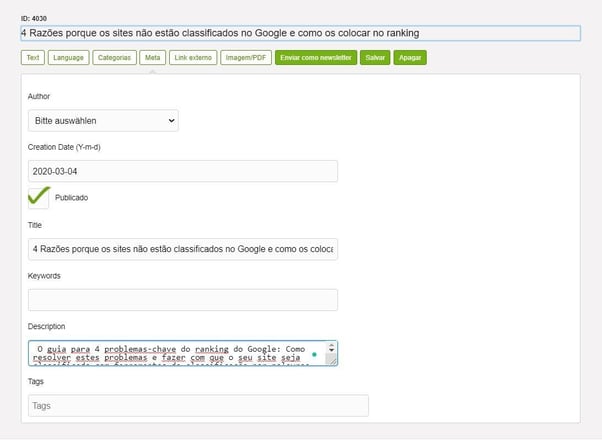 Alguns de vocês podem pensar que nos escapou uma meta tag, a saber, meta tags de palavras-chave. Ainda temos a opção de adicioná-las durante o processo de postagem, mas provavelmente há coisas melhores a fazer com seu tempo. No que diz respeito ao Google, estas meta palavras-chave não têm valor para SEO. No vídeo acima, Matt Cutts afirma diretamente que o Google não usa mais meta palavras-chave. A principal razão para isto é que o conteúdo das meta tags das palavras-chave não é exibido na página e isto fez com que elas se tornassem famosas para o recheio de palavras-chave: Blackhat SEO preenche as meta tags de palavras-chave com palavras-chave não representativas do conteúdo de uma página, então os mecanismos de busca não confiam nas meta tags para serem um indicador confiável do que realmente se trata o conteúdo de uma página.