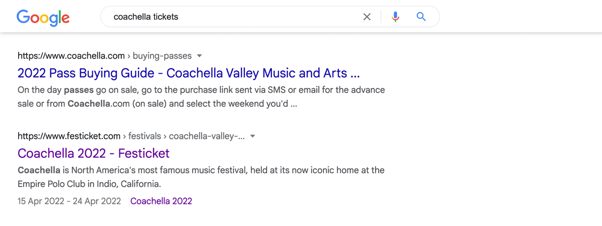 Os organizadores do festival Coachella usam a mesma URL para as páginas-chave do site a cada ano - ingressos, fila, informações, etc., mas atualizam as datas em locais cruciais de palavras-chave que podem ser editadas, tais como cabeçalhos e meta título de texto de muitos corpos, meta descrição e imagem alt tags. É assim que aparece nos resultados de pesquisa do Google