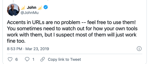Aqueles que oferecem um website em vários idiomas naturalmente perguntarão: o que dizer de cartas com acentos. John Mueller, o homem principal do Google, responderá esta para mim.
