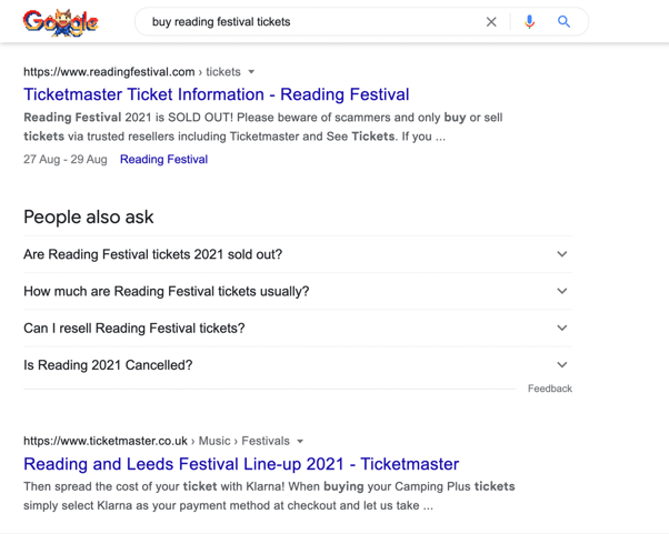 Independentemente da parte das URLs que você decidir colocar suas palavras-chave, preste atenção ao endereço de suas subpáginas e sempre opte por palavras-chave em vez de palavras e números aleatórios. Um site com uma estrutura de URL amigável ao SEO será classificado muito melhor do que um sem. Ele também lhe dará mais cliques na página de resultados do mecanismo de busca porque essas palavras-chave em destaque atrairão pesquisadores que podem até ser usados para criar um tipo de CTA como com este exemplo de melhor prática do lendário festival Reading Rock que aponta para os ingressos de uma forma atraente com sua configuração de URL.